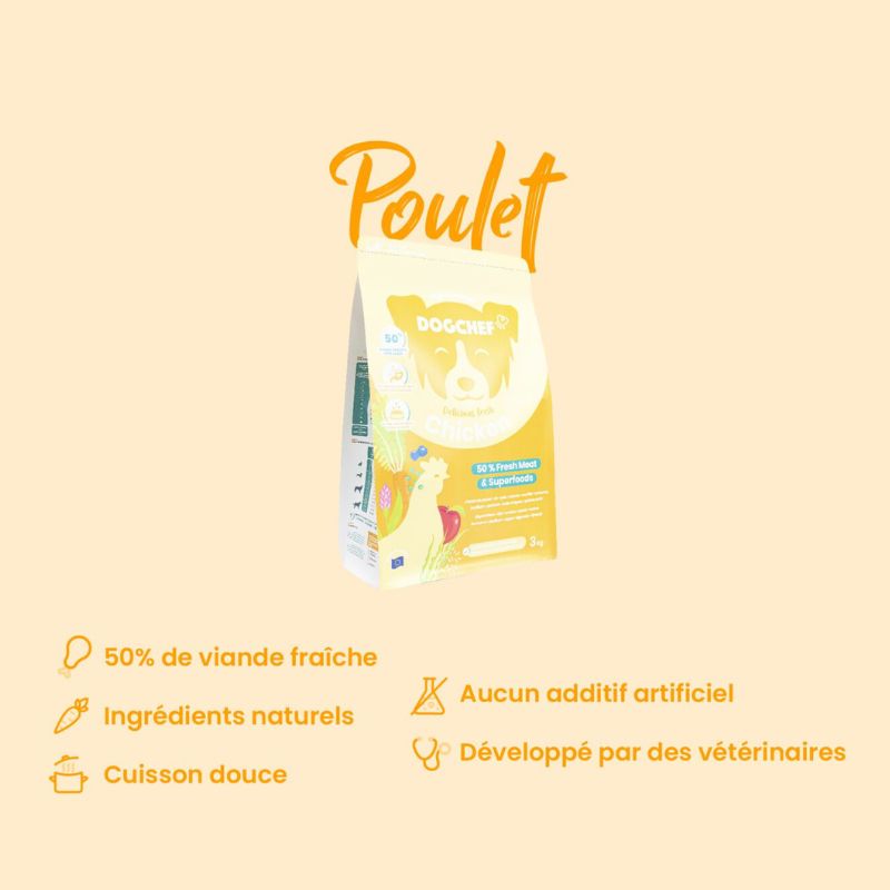 De délicieuses croquettes au poulet, 🛻 livrées chez vous pour ne jamais être à court de nourriture pour votre chien. Les croquettes Dogchef sont composées d’ingrédients naturels 🌾, avec de la viande fraiche et sans conservateurs. Le meilleur régime croquettes pour votre berger australien.